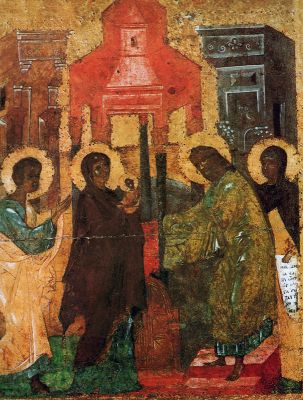 Alongside with the Annuciation, the Nativity, and the Baptism, the Meeting was one of the leading scenes in mosaic adornment of churches during the mid-Byzantine period—the churches of Agios Lukas in Phokida, Neo Moni on Chios, and of the Dormition in Daphne. In Rus’, the most ancient images of the Meeting of the Lord are the frescoes of the mid-11th century in the Pskov Mirozh Monastery cathedral, as well as 11th century frescoes in the St. Cyril Church (Kiev) and the Church of the Savior on the Nereditsa (Novgorod). On the fresco in the Church of the Dormition on Volotov Field (Novgorod, mid-14th c.), Symeon with the Infant in his arms is placed by the low, closed doors leading into the Holy of Holies. Many icons of the Meeting of the Lord preserved to our times are a part of the festal row of icons on church iconostases.