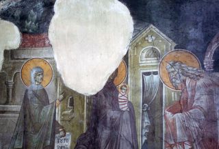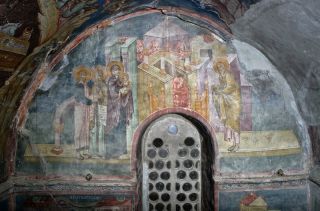 The most ancient image of the Meeting of the Lord preserved to the present day is depicted in one of the mosaics of the triumphal archway that frames the altar area of the Church of Santa Maria Maggiore in Rome (432-440). The scene with multiple figures of the Meeting of the Lord is interpreted here as the Mother of God’s walk with the Infant in her hands, accompanied by angels, to meet St. Symeon. The measured rhythm of this walk is set by the rhythm of the colonnades with arches, which is the background behind this action. Symeon, stooping with age, stands in the opening and stretches his arms to Christ, his hands draped with a mantle. Behind his back are men (possibly scribes and priests of the Jerusalem temple). On the frescoes in the church of Santa Maria in Castelserpio in Italy, painted by a Byzantine master (late 7th c.), Symeon is depicted with emphasis on his ancientness, with long hair—according to tradition, in anticipation for over 300 years of his meeting with the Lord as promised to him by the angel. Yet another ancient monument of iconography of the Meeting of the Lord, created before the era of iconoclasm, is the Constantinople mosaic in the Church of the Theotokos Kyriotissa (which during the Ottoman era was turned into the Kalendarkhane Mosque). Here the Infant Christ is also held in the arms of the Mother of God, while in monuments created after the iconoclastic period the Infant Christ is shown held by Symeon. The Mother of God is often depicted as sorrowful, feeling beforehand her Son’s suffering on the Cross according to the prophecy of Symeon: Yea, a sword shall pierce through thy own soul also (Lk. 2:35).