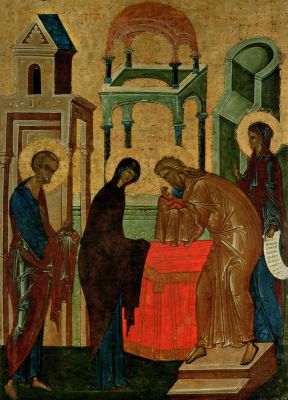 Alongside with the Annuciation, the Nativity, and the Baptism, the Meeting was one of the leading scenes in mosaic adornment of churches during the mid-Byzantine period—the churches of Agios Lukas in Phokida, Neo Moni on Chios, and of the Dormition in Daphne. In Rus’, the most ancient images of the Meeting of the Lord are the frescoes of the mid-11th century in the Pskov Mirozh Monastery cathedral, as well as 11th century frescoes in the St. Cyril Church (Kiev) and the Church of the Savior on the Nereditsa (Novgorod). On the fresco in the Church of the Dormition on Volotov Field (Novgorod, mid-14th c.), Symeon with the Infant in his arms is placed by the low, closed doors leading into the Holy of Holies. Many icons of the Meeting of the Lord preserved to our times are a part of the festal row of icons on church iconostases.