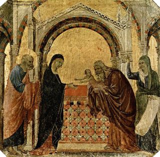 The iconography for the Meeting of the Lord is based upon the Gospel passage of St. Luke (Lk. 2:22-39). On the icons, frescoes, and miniatures the key activity is the Theotokos giving the Child into the hands of Symeon; behind her is Joseph the Betrothed carrying doves either in his hands or in a cage, and behind Symeon is the prophetess Anna with a scroll in her hands.