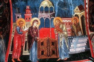 The most ancient image of the Meeting of the Lord preserved to the present day is depicted in one of the mosaics of the triumphal archway that frames the altar area of the Church of Santa Maria Maggiore in Rome (432-440). The scene with multiple figures of the Meeting of the Lord is interpreted here as the Mother of God’s walk with the Infant in her hands, accompanied by angels, to meet St. Symeon. The measured rhythm of this walk is set by the rhythm of the colonnades with arches, which is the background behind this action. Symeon, stooping with age, stands in the opening and stretches his arms to Christ, his hands draped with a mantle. Behind his back are men (possibly scribes and priests of the Jerusalem temple). On the frescoes in the church of Santa Maria in Castelserpio in Italy, painted by a Byzantine master (late 7th c.), Symeon is depicted with emphasis on his ancientness, with long hair—according to tradition, in anticipation for over 300 years of his meeting with the Lord as promised to him by the angel. Yet another ancient monument of iconography of the Meeting of the Lord, created before the era of iconoclasm, is the Constantinople mosaic in the Church of the Theotokos Kyriotissa (which during the Ottoman era was turned into the Kalendarkhane Mosque). Here the Infant Christ is also held in the arms of the Mother of God, while in monuments created after the iconoclastic period the Infant Christ is shown held by Symeon. The Mother of God is often depicted as sorrowful, feeling beforehand her Son’s suffering on the Cross according to the prophecy of Symeon: Yea, a sword shall pierce through thy own soul also (Lk. 2:35).