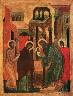 Alongside with the Annuciation, the Nativity, and the Baptism, the Meeting was one of the leading scenes in mosaic adornment of churches during the mid-Byzantine period—the churches of Agios Lukas in Phokida, Neo Moni on Chios, and of the Dormition in Daphne. In Rus’, the most ancient images of the Meeting of the Lord are the frescoes of the mid-11th century in the Pskov Mirozh Monastery cathedral, as well as 11th century frescoes in the St. Cyril Church (Kiev) and the Church of the Savior on the Nereditsa (Novgorod). On the fresco in the Church of the Dormition on Volotov Field (Novgorod, mid-14th c.), Symeon with the Infant in his arms is placed by the low, closed doors leading into the Holy of Holies. Many icons of the Meeting of the Lord preserved to our times are a part of the festal row of icons on church iconostases.