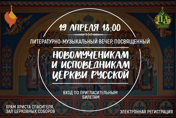 19 апреля 2018 года в 18.00 по благословению Святейшего Патриарха Кирилла в Зале церковных соборов Храма Христа Спасителя в Москве состоится литературно-музыкальный вечер, посвященный новомучениками и исповедникам Церкви Русской, выпускникам Санкт-Петербургской духовной академии, сообщает Патриархия.ru.