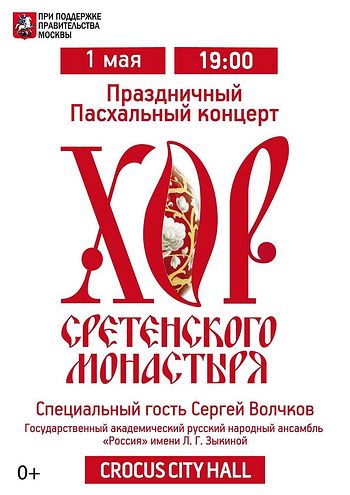 Большой праздничный Пасхальный концерт хора Московского Сретенского монастыря на сцене Крокус Сити Холла в этом году пройдет в день Светлого Христова Воскресения – 1 мая. Программа концерта будет состоять из двух отделений - шедевры русской духовной музыки и всеми любимые народные песни, которые будут исполнены в неповторимой манере мужского хора.