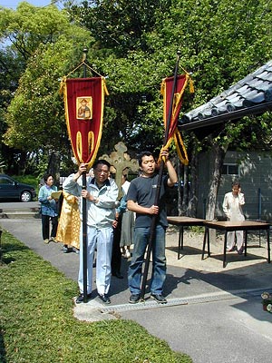 Михаил Мицудзава Норимаса и Стефан Нобата Соити во время пасхального крестного хода в приходе Ханда