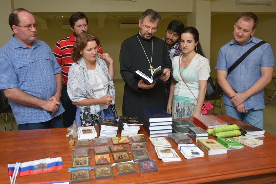 За време своје прве посете, 13. фебруара, после Литургије у антиохијској цркви Рођења Пресвете Богородице, коју је служио парох Душан Михајловић, професори су предали поклоне парохији које су донели из Москве: књиге и брошуре за мисионарски рад, међу којима су неке штампане на шпанском језику, крстиће, иконе, богослужбене књиге и дароносицу за оца Душана. О. Душан је захвалио гостима на њиховом труду и богатим поклонима, после чега је позвао све присутне у салу у којој се одржало предавање и беседа са парохијанима. Међу присутнима су били и чланови парохије Св. Нектарија Егинског (РПЗЦ), коју чине углавном Чилеанци, са њиховим ђаконом Робертом Леоном Рамирезом на челу. Специјално за ту прилику обезбеђен је и преводилац, Ана Николајева, члан парохије Св.Николаја Велимировића.