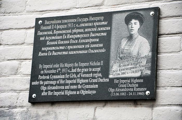 В городе Павловске Воронежской области увековечили память родной сестры последнего Российского императора, царя-страстотерпца Николая II, Великой княгини Ольги Александровны Романовой. 4 ноября в рамках традиционных ежегодных торжеств на здании Ольгинской гимназии была открыта мемориальная доска в честь Великой княгини, которая являлась покровительницей этого учебного заведения с 1913 года.