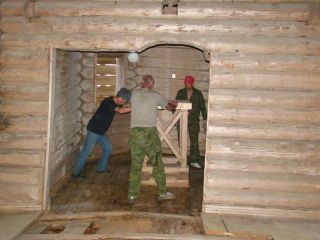 • Разобраны столы и лавки, сооружённые в алтарной части из досок пола, доски возвращены на место, двери крыльца сняты с петель и помещены в сухое продуваемое место.