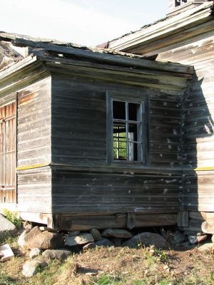 - С использованием домкратов при участии местных жителей выправлен и поставлен на новый валунный фундамент просевший юго-западный угол здания;