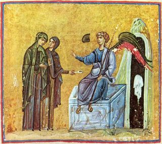 The myrrh-bearing women and angel on the tomb. Fresco in a cave church in Cappadocia.6th c.