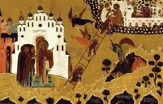 Святой Иоанн сказал нам о том, что по примеру лестницы на самом деле жизнь человеческая – это вертикаль. Не диванно-разнеженная горизонталь. Но суровая каждодневная вертикаль. Либо вверх, либо вниз. И так каждую секунду. Выбор между добром и злом. Уступить место женщине в маршрутке или равнодушно отвернутся к окну; открыть рот в ссоре с мужем и высказать ему ВСЕ или промолчать и уйти в другую комнату от греха подальше, пока не остынешь; подать нищему или пройти мимо, оправдав себя десятками мыслей; встать в воскресенье утром и заставить пойти себя на церковную службу или заварить себе кофе, сделать бутерброд и включить любимый сериал.
