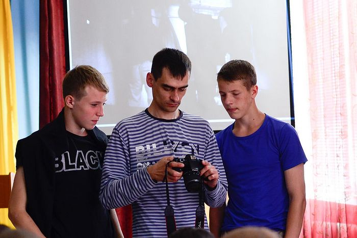 Наконец, перешли к теории фотографии. Дмитрий наглядно показывал ребятам как делать качественные снимки, рассказал о том, как правильно настроить камеру, о том, что такое «баланс белого», «диафрагма», «выдержка», «ISO» и прочие показатели, которые влияют на качество фотоснимка и которые просто обязан знать каждый, кто берет в руки зеркальный фотоаппарат. Кроме того, ученикам раздали специально подготовленные для них буклеты, в которых отражена вся теоретическая база, включая устройство фотоаппарата.