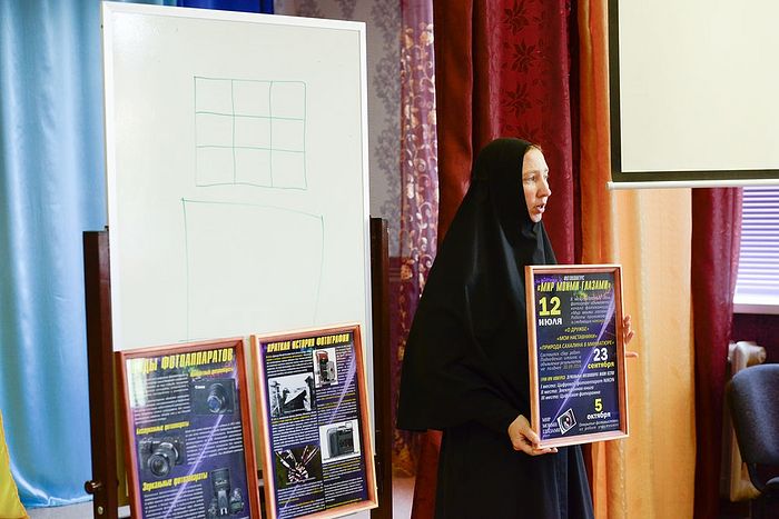 После разбора фильма мы перешли непосредственно к открытию фотоконкурса. Куратор волонтерского корпуса «Доброе Дело» монахиня Илариона (Фунтова) объявила номинации конкурса, рассказала о сроках и о том, чему будут уделять особое внимание при оценке работ.